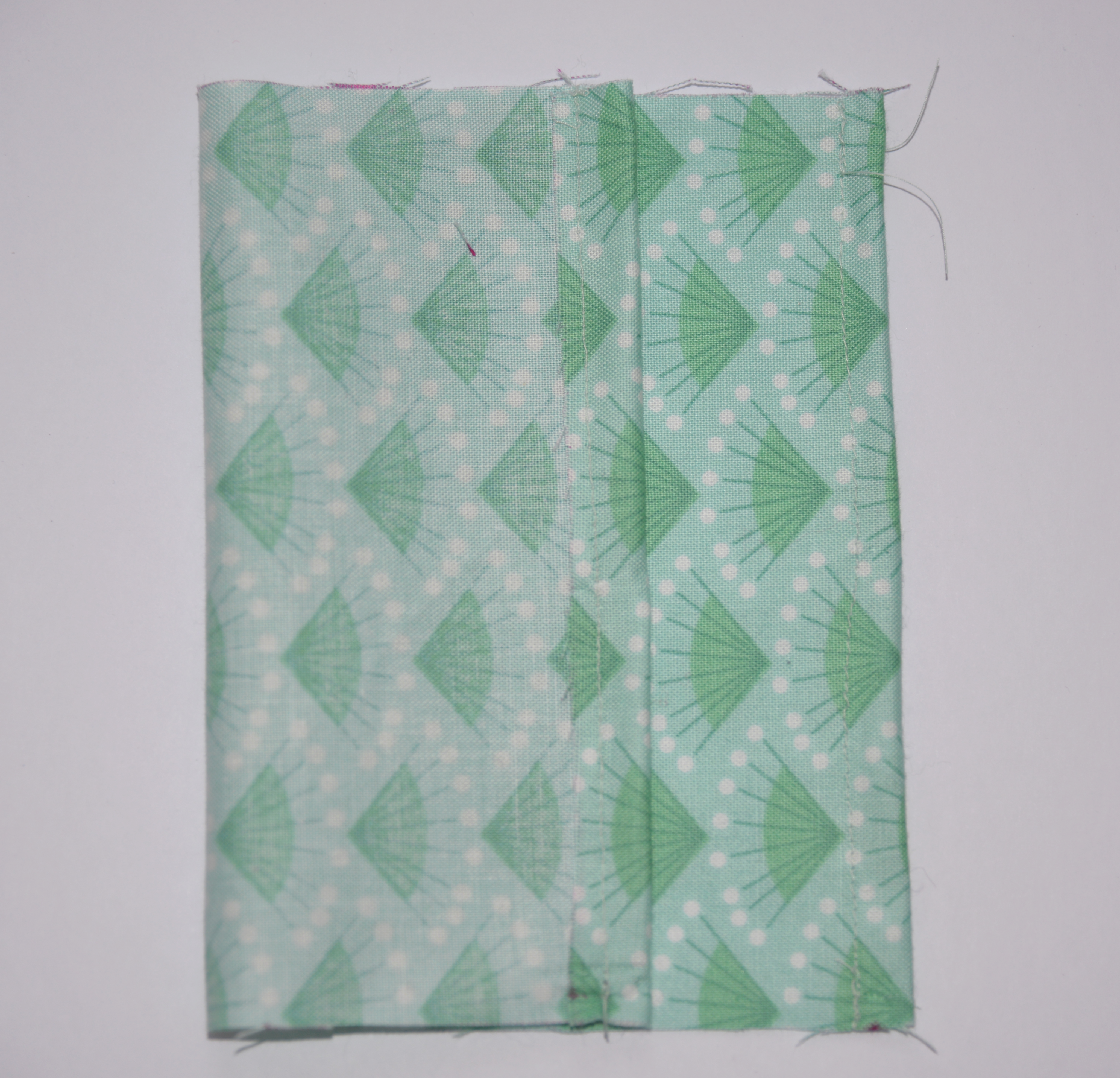 Pliez ensuite votre rectangle de tissu en rabattant chaque côté avec un ourlet, endroit contre endroit. Ne les placez pas pile au milieu, mais décalez plutôt un côté au deux tiers du tissu, comme sur la photo ci-dessous. Faites ensuite une couture tout autour.