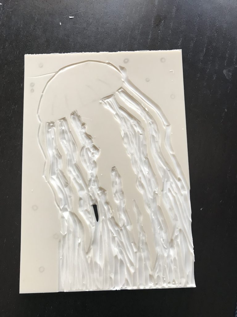 J’ai choisi de dessiner une méduse. J’ai fait un dessin assez simple pour commencer avec peu de détails pour pouvoir facilement m’entraîner avec les gouges. Je voulais donc que toute la méduse soit visible à l’impression, je devais donc creuser tout autour. J’ai également tracé quelques sillons pour ajouter un peu de relief et ne pas imprimer une grosse masse informe!