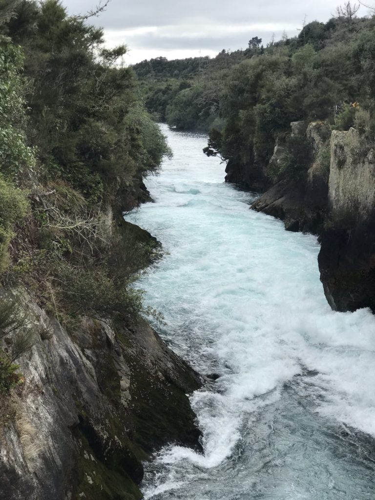 Après Wellington, nous avons fait une courte halte dans la ville de Taupo. Cette ville, posé au bord du lac Taupo créé après une éruption volcanique, propose pas mal d’activités: tour de bateau, kayak, bateau dans les rapides etc. Nous avons choisi de voir les Huka Falls, des chutes d’eau impressionnantes et de couleur turquoise. Le fleuve Waikato quitte le lac Taupo pour rejoindre la mer et un goulot d’étranglement forme alors des rapides très impressionnantes. Vous pouvez vous mettre sur un belvédère aménagé et admirer les rapides. Les lieux sont très sympas! Par contre, n’essayez pas de vous baigner, le courant est bien trop fort. Vous pouvez aussi faire du jetboat qui s’approche des rapides. Les gens avaient l’air plutôt heureux de l’activité, mais nous avons passé notre tour car cela coutait une centaine de dollars pour 35minutes de bateau.